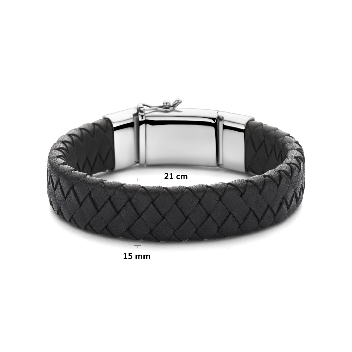 Zwart leer armband met een draaglengte van 21cm en een breedte van 15mm.