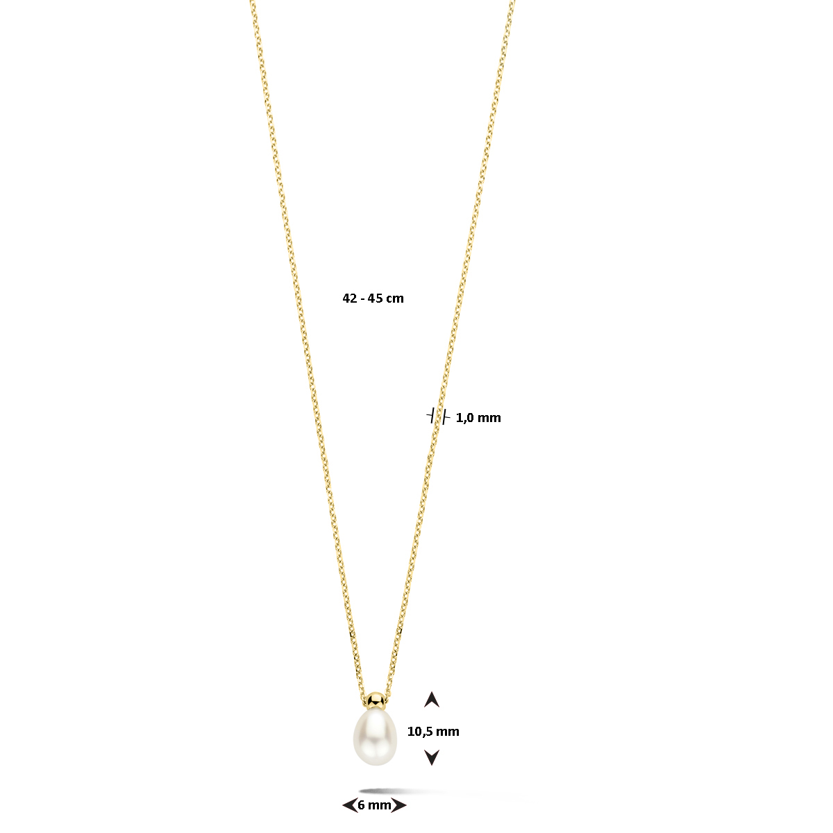 14k Geelgouden collier uitgevoerd met een zoetwaterparel. Het collier heeft een draaglengte van 42cm en een extensie van 3cm.