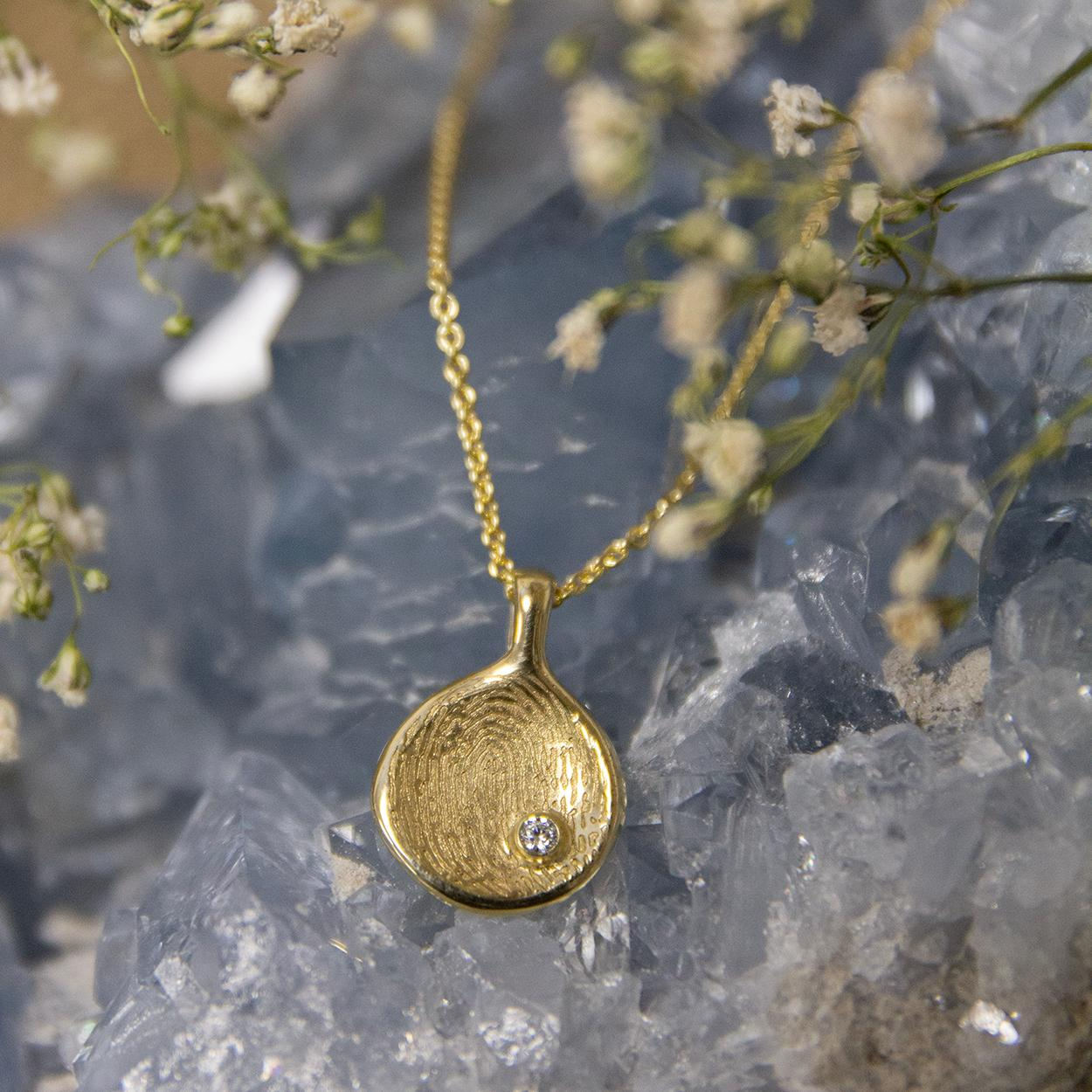 Een zelfontworpen hanger met diamant. Zeer geschikt om te graveren, bijvoorbeeld een letter, naam of vingerafdruk.
