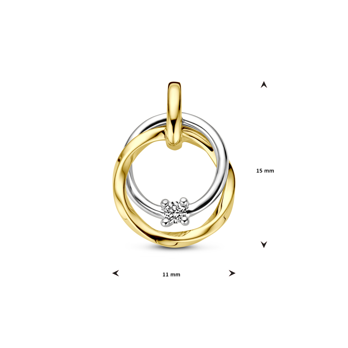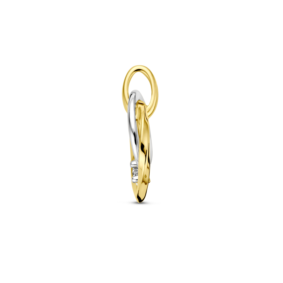 14k Bi-color geel- en witgouden hanger uitgevoerd met diamant. De hanger heeft een totale hoogte van 15mm.