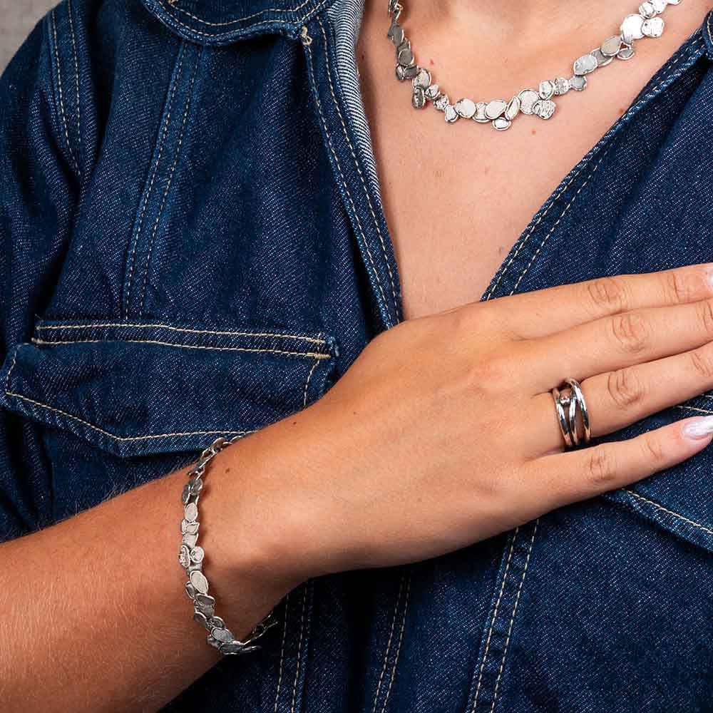 Een stijlvolle armband van 925 sterling zilver met glanzende afwerking. De verfijnde schakels, geïnspireerd op de vorm van blaadjes, geven het sieraad een natuurlijke en sierlijke uitstraling.