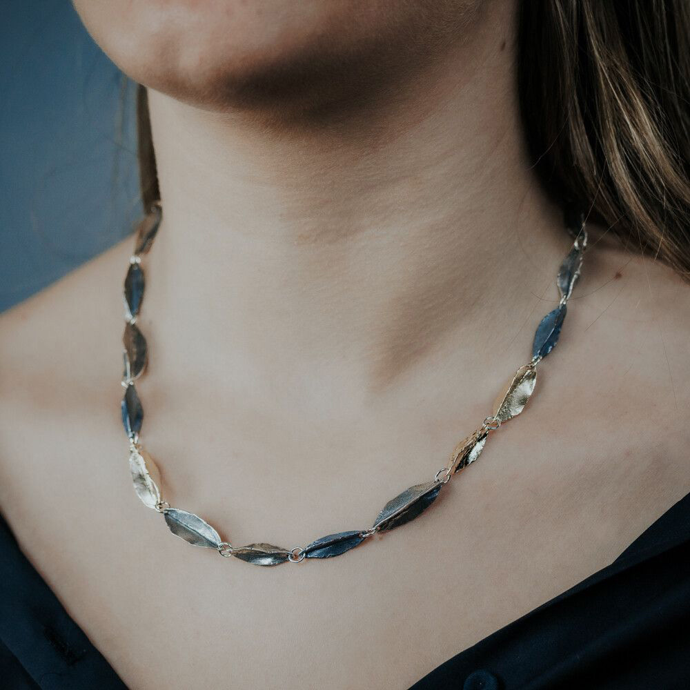 Collier met gevouwen blaadjes, gemaakt van 925 (geoxideerd) sterling zilver en zilver verguld. Het collier is verstelbaar waardoor u het op verschillende lengtes kunt dragen.