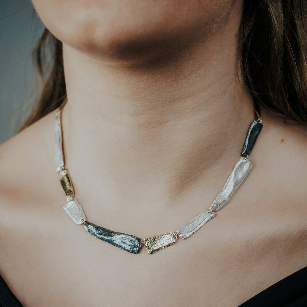 Een prachtig collier gemaakt van 925 (geoxideerd) sterling zilver en zilver verguld. De schakels hebben verschillende lengtes en vormen wat het collier extra bijzonder maakt. Het collier is verstelbaar waardoor je hem ook op een andere lengte kunt dragen.