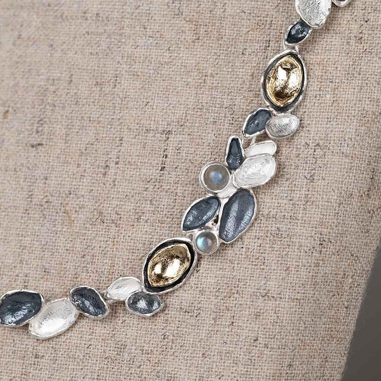 Collier gemaakt van blaadjes van 925 sterling zilver, geoxideerd zilver en zilver verguld met tussen de blaadjes Labradoriet.