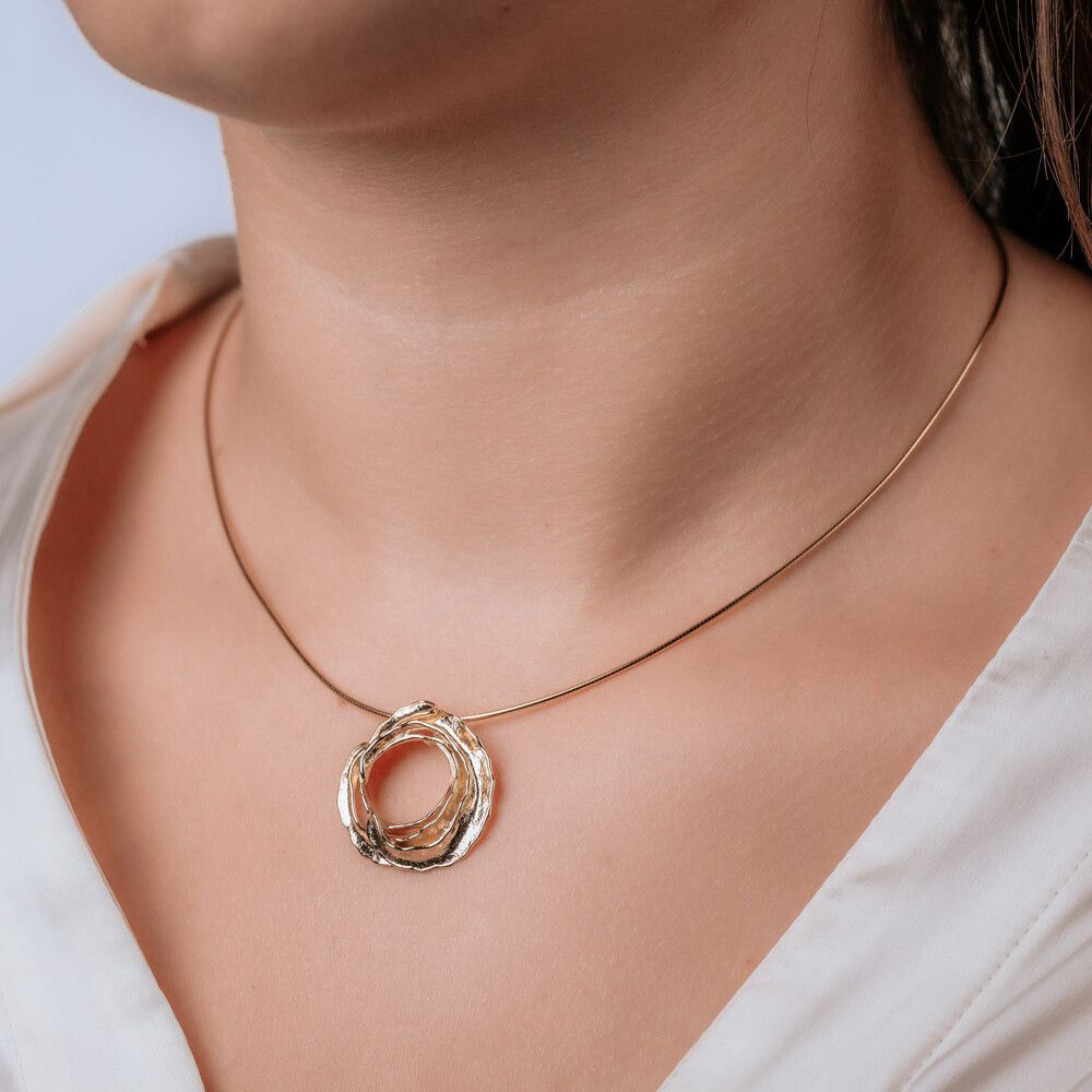 Een prachtige hanger met een opening in het midden en rond gekruld. Gemaakt van 14 kt geelgoud