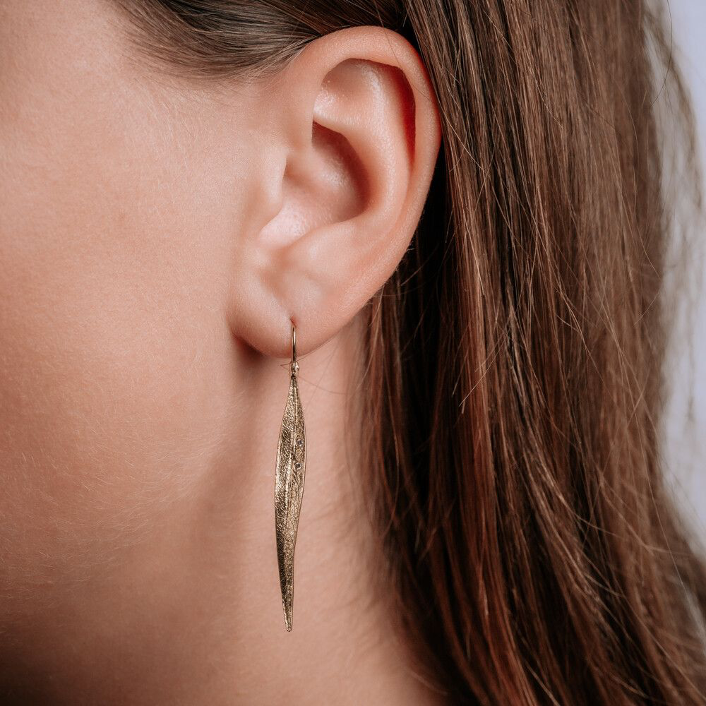 Prachtige bladvormige oorhangers gemaakt van 14 karaat goud met in beide oorbellen een diamant (0.04 ct + H-I / VS-SI1).