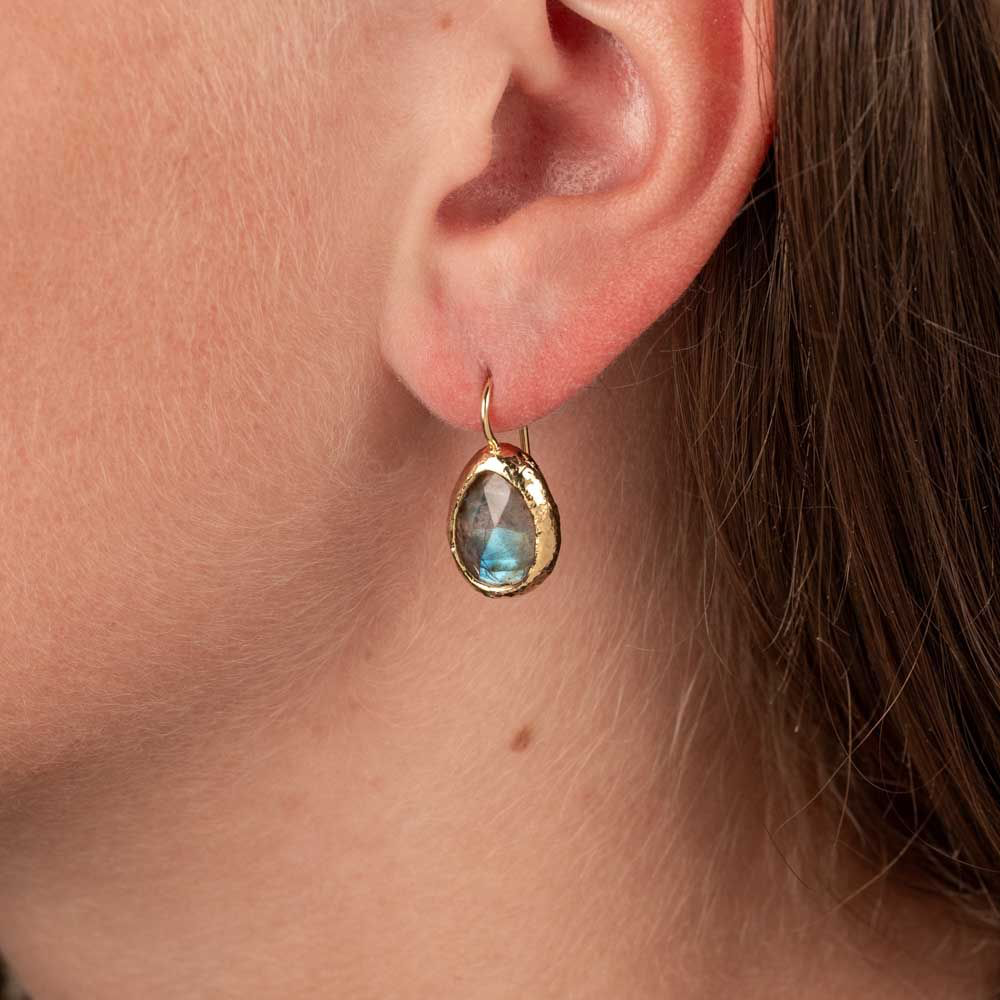 Elegante oorhangers in druppelvorm. Gemaakt van zilver verguld in combinatie met de edelsteen Labradoriet. Ook verkrijgbaar met Maansteen.