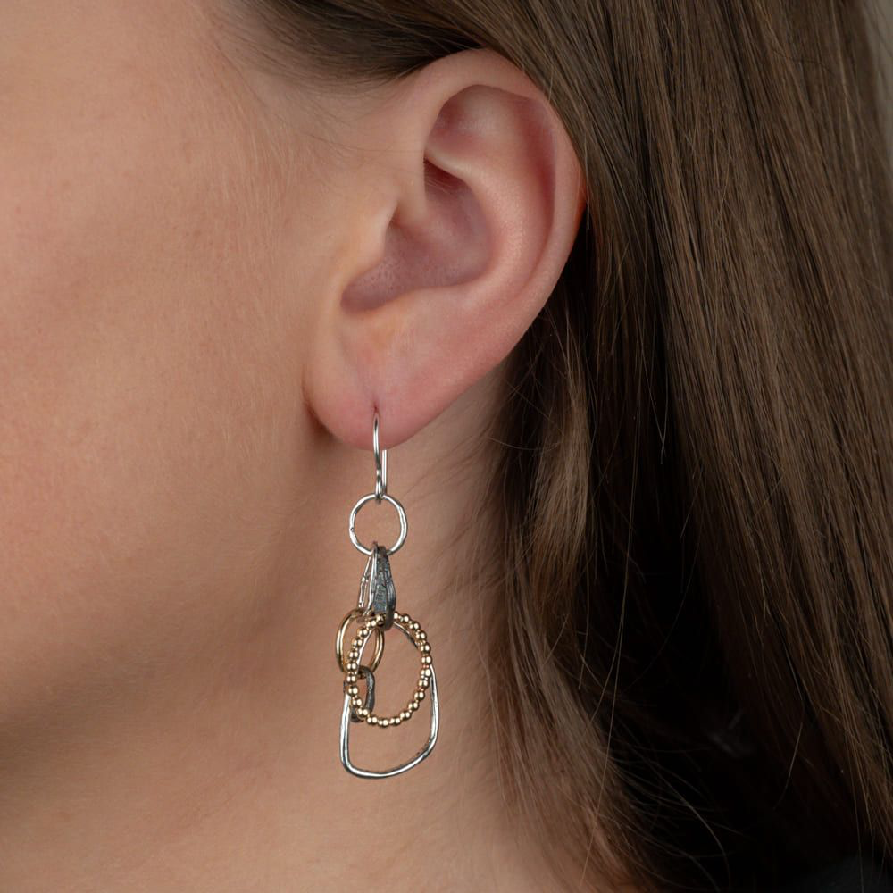 Oorhangers gemaakt van 925 sterling zilver, geoxideerd zilver en Goldfilled. Er zitten verschillende vormen ringetjes aan deze oorbellen, wat hem erg speels en uniek maakt!