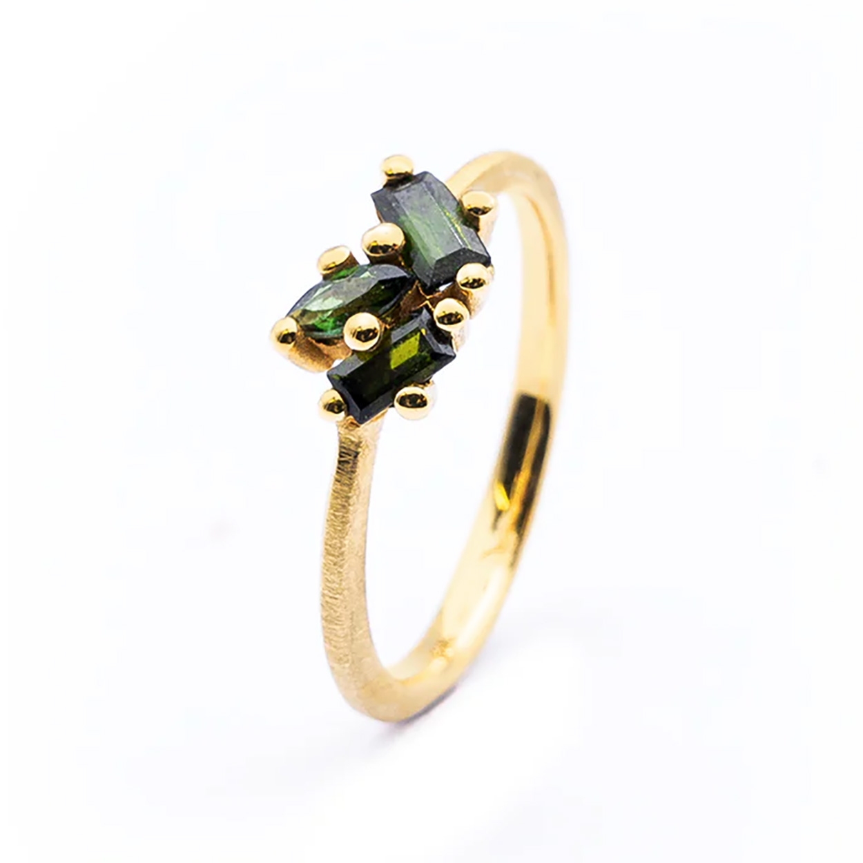 Een prachtige geelgouden ring met 3 toermalijnen.