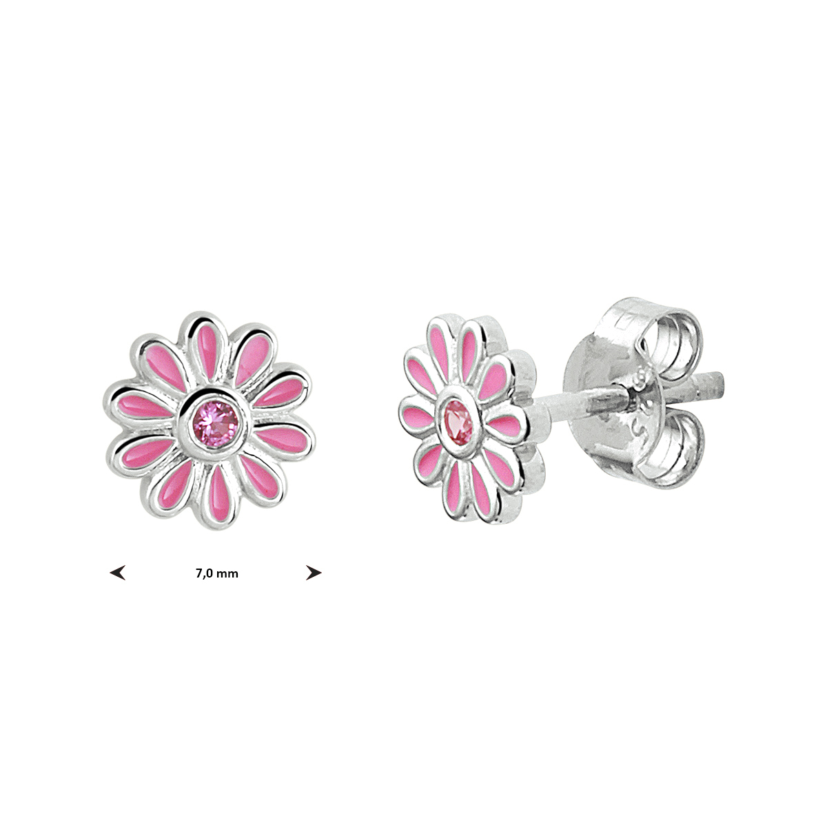 Gerhodineerd 925 zilveren oorknoppen uitgevoerd in de vorm van een emaille bloem met een schitterende roze zirkonia. De oorknoppen hebben een diameter van 7mm.