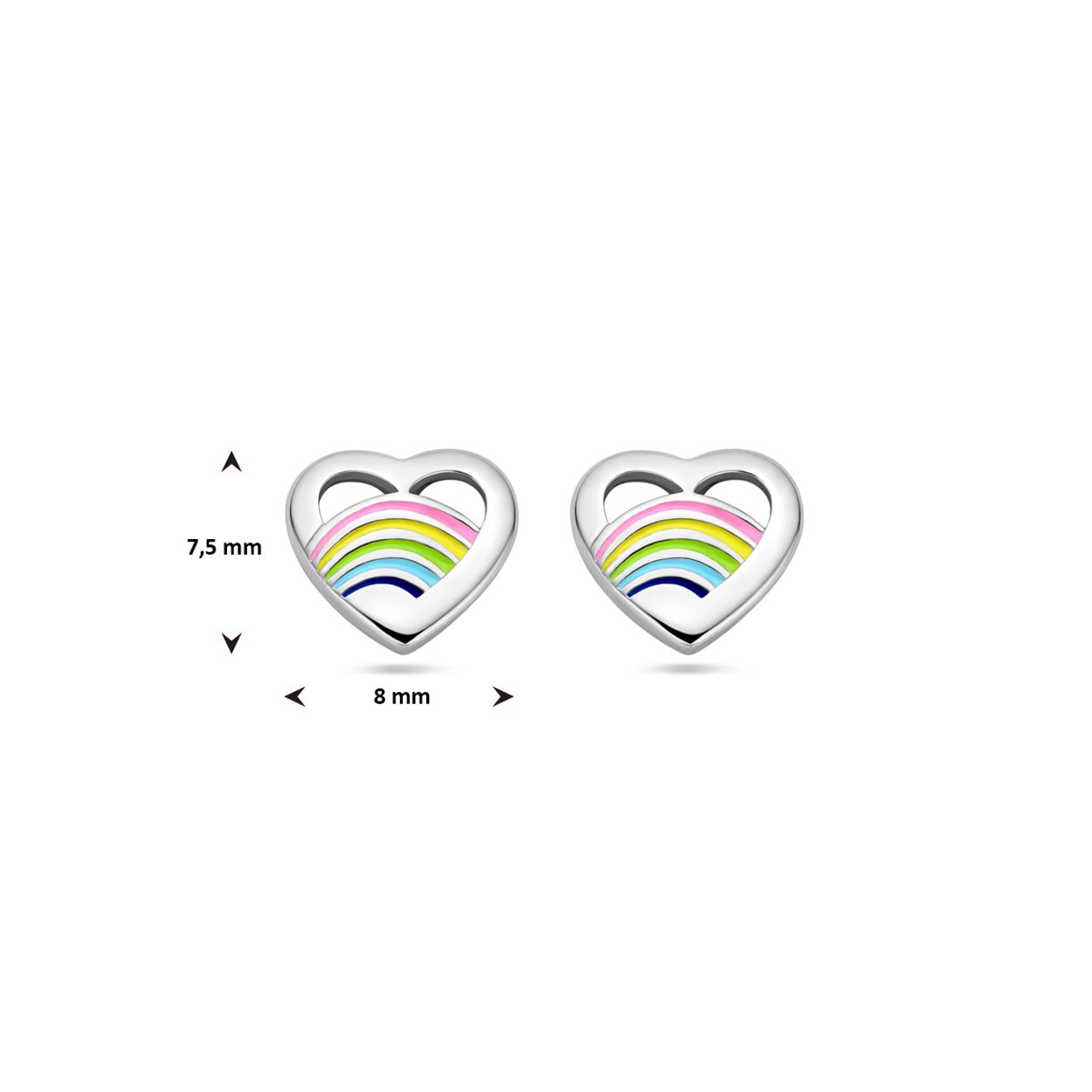 Gerhodineerd 925 zilveren oorknoppen uitgevoerd in de vorm van een hart met roze, geel, groen en blauw emaille. De oorknoppen hebben een afmeting van 7.5x8mm.