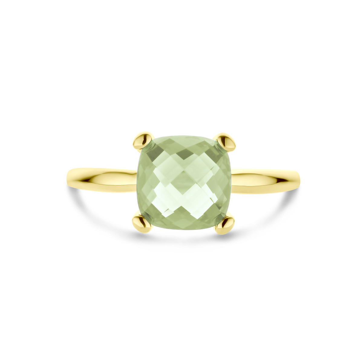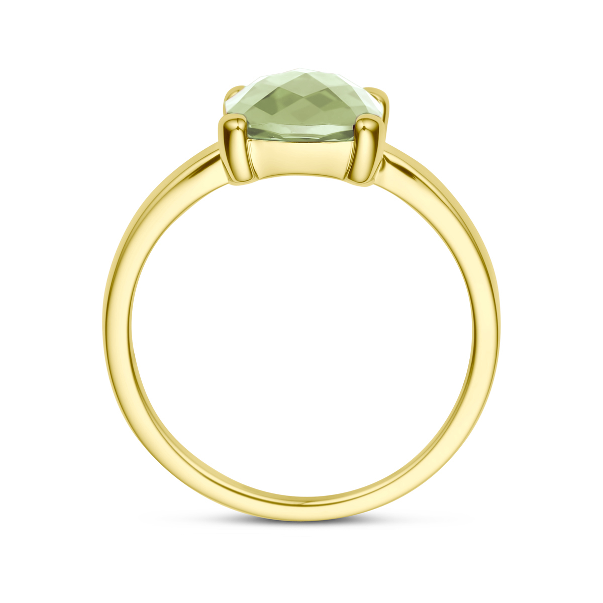 14k geelgouden ring uitgevoerd met groen amethist. De breedte van de ring is 8.5mm.