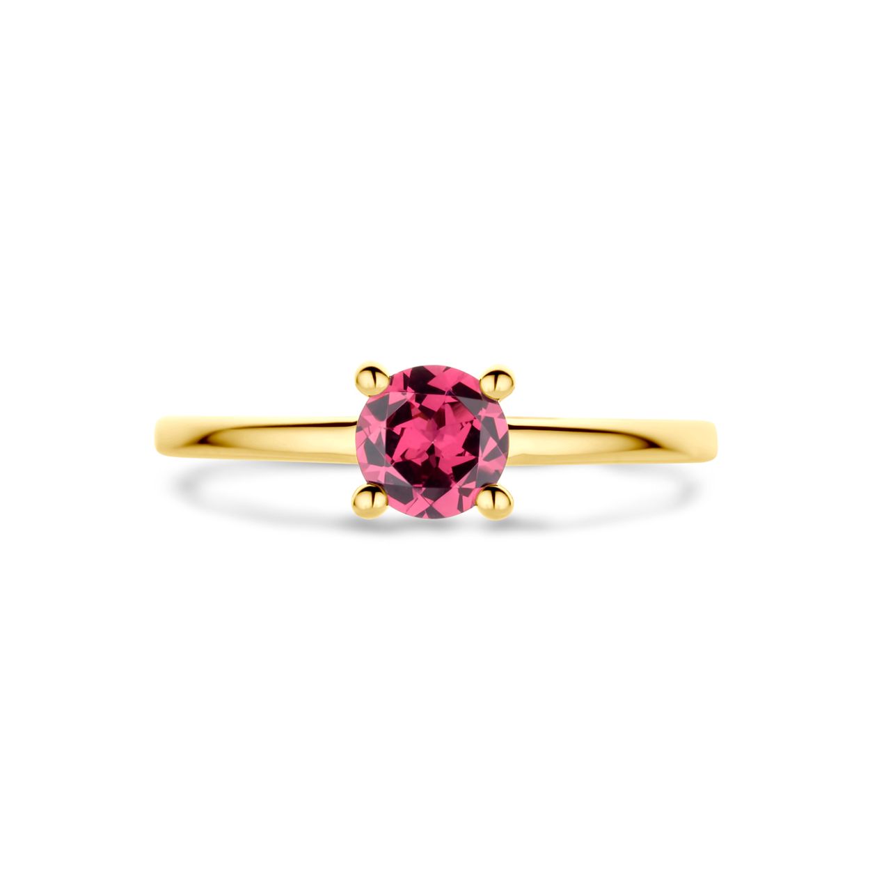 14k Geelgouden ring uitgevoerd met roze rhodoliet. De steen heeft een diameter van 5mm.
